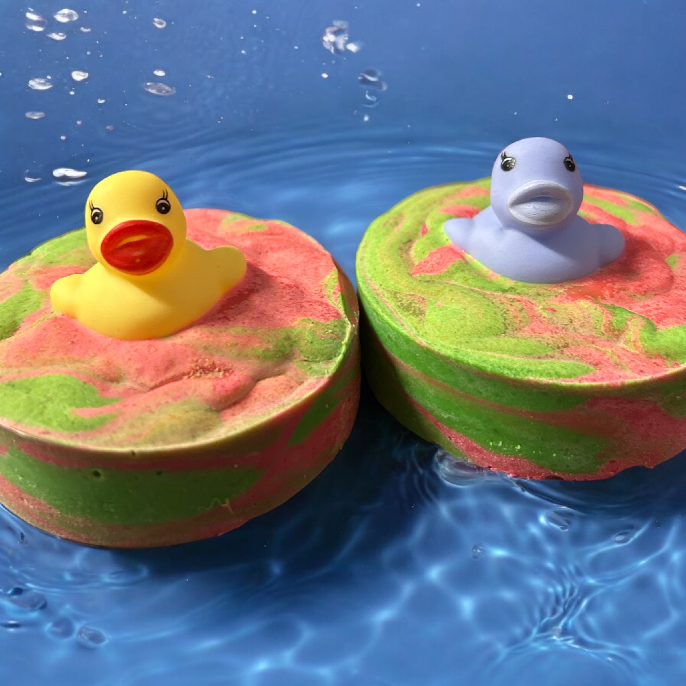 Shh, don’t tell anyone, but this soap bar is for the kid in you (and the actual kids too, we won’t judge)! Â The Bubbles-n-Ducks Soap bar is a whimsical wonder, featuring a lime green and hot pink color scheme, a rubber ducky on top, and a scent that’s, ahem, a little monkey-ish. Â It’s the perfect size for small hands a guaranteed tub-time hoot!!